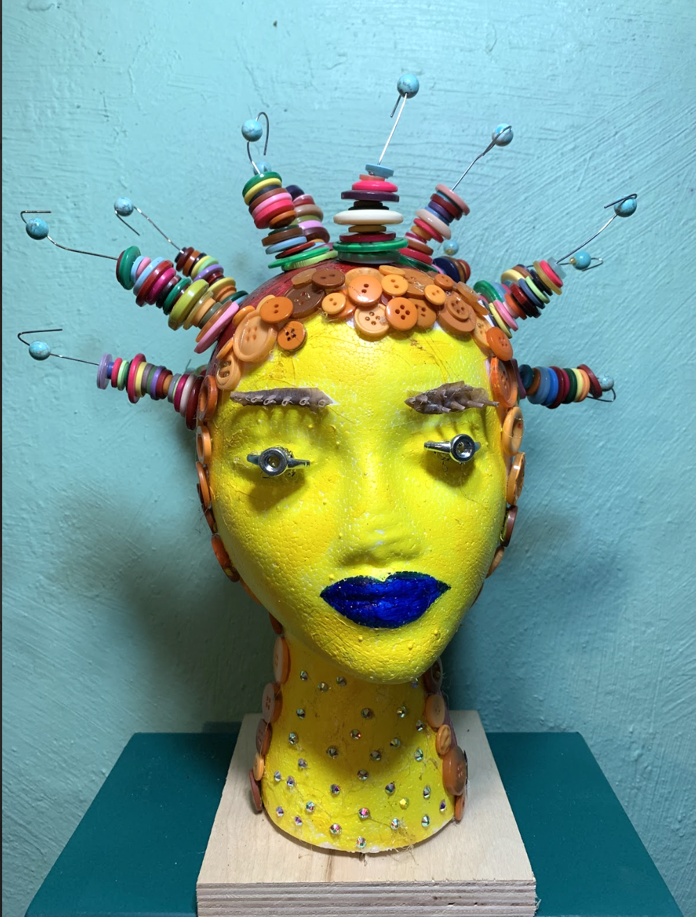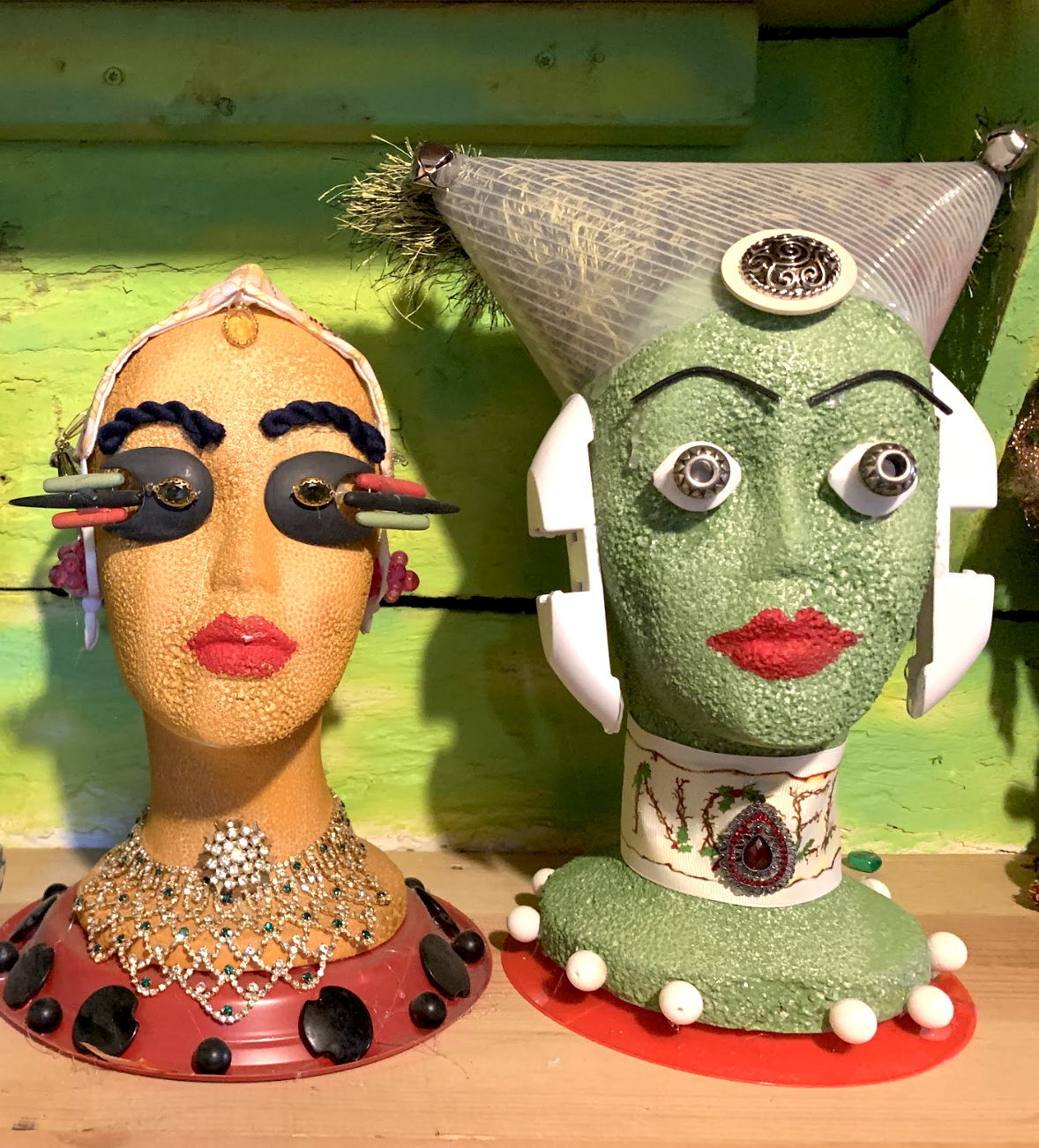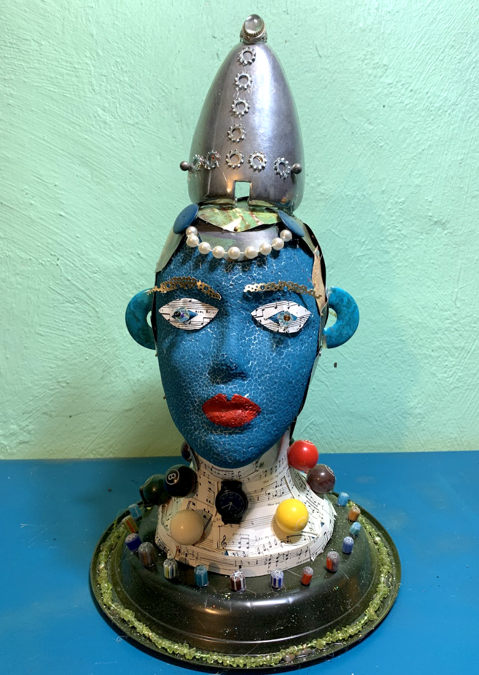 These heads are the epitome of upcycling. With the exception of the head itself, all of the attached pieces are from found objects, every day household items, and trash. The heads are an expression of ways to use things more than once, while serving as a source of entertainment in their making. Reusing every day items gives one a new perspective on every day, functional objects, and how they can be transformed in a creative way.